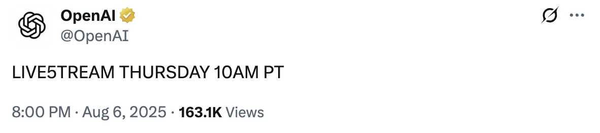 Компанія OpenAI натякнула на важливий анонс, запланований на четвер, 7 серпня. В офіційному повідомленні в соціальній мережі X замість звичного слова «livestream» використано написання «LIVE5TREAM» з цифрою 5 замість літери S. Це викликало хвилю припущень, що йдеться про представлення мовної моделі GPT-5.