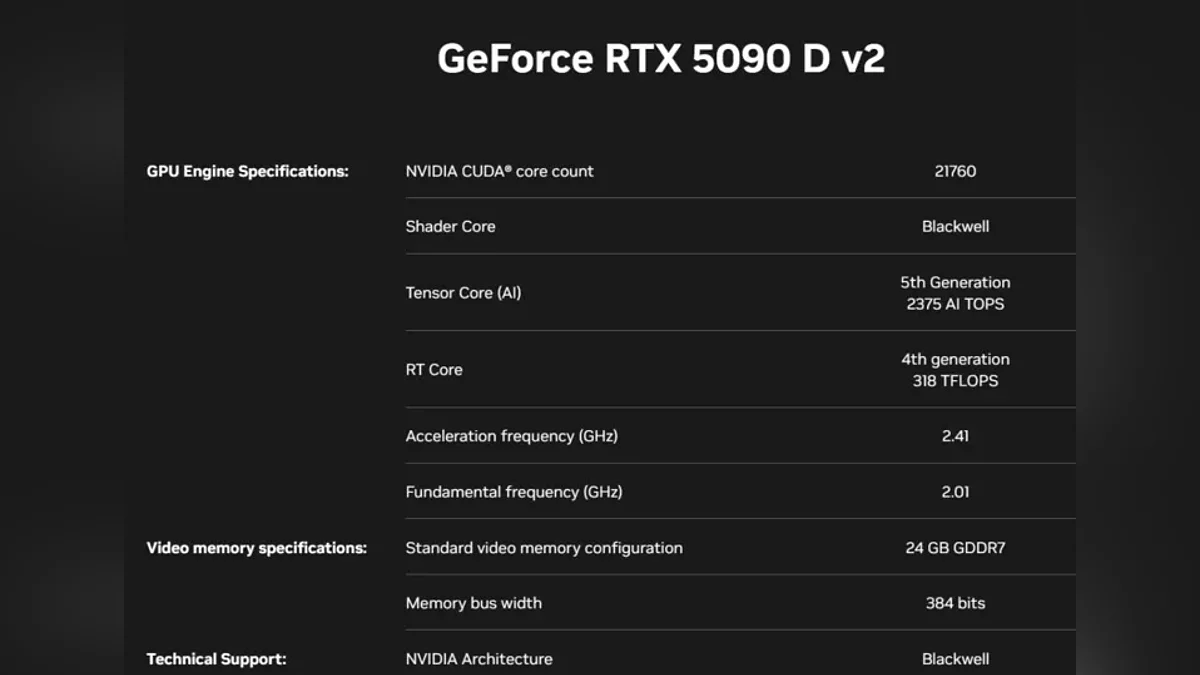 Новинка зберегла ключові елементи флагманської архітектури Blackwell. Як і стандартна RTX 5090, китайська версія використовує графічний процесор GB202-240 з 21 760 ядрами CUDA. Частоти також залишилися незмінними, досягаючи 2.41 ГГц у режимі динамічного розгону. Заявлене енергоспоживання (TDP) складає 575 Вт. Головна відмінність нової карти — змінена конфігурація пам'яті. Замість 32 ГБ GDDR7 з 512-бітною шиною, як у базових моделях, RTX 5090D V2 отримала 24 ГБ пам'яті GDDR7 з 384-бітною шиною. Пропускна здатність пам'яті знижена до 1344 ГБ/с.