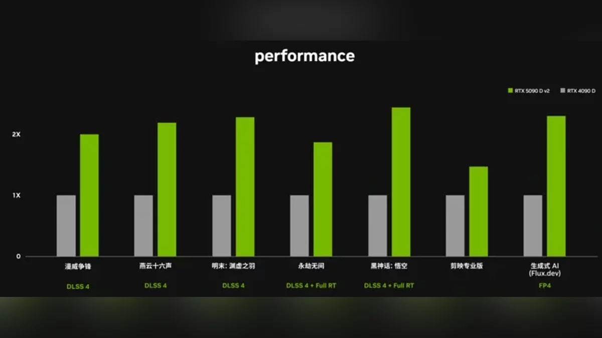 NVIDIA представила результати тестів карти в іграх, порівнюючи її з RTX 4090D. Однак ці дані викликали питання: у тестах активно використовувалася технологія DLSS MFG (Multi Frame Generation), що ускладнює пряму оцінку реальної продуктивності «заліза». Рекомендована ціна RTX 5090D V2 в Китаї встановлена на рівні 16 499 юанів (близько 182 000 рублів), що відповідає вартості попередньої моделі RTX 5090D до припинення її постачань.