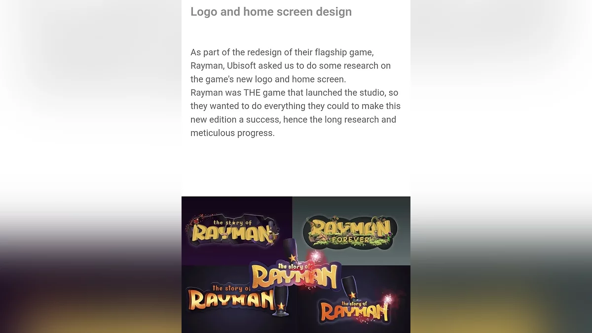 В рамках редизайну своєї флагманської гри Rayman компанія Ubisoft попросила нас провести дослідження нового логотипу і домашнього екрану гри. Rayman була грою, з якої почалася студія, тому вони хотіли зробити все можливе, щоб нове видання стало успішним, звідси довгі дослідження і скрупульозна робота.