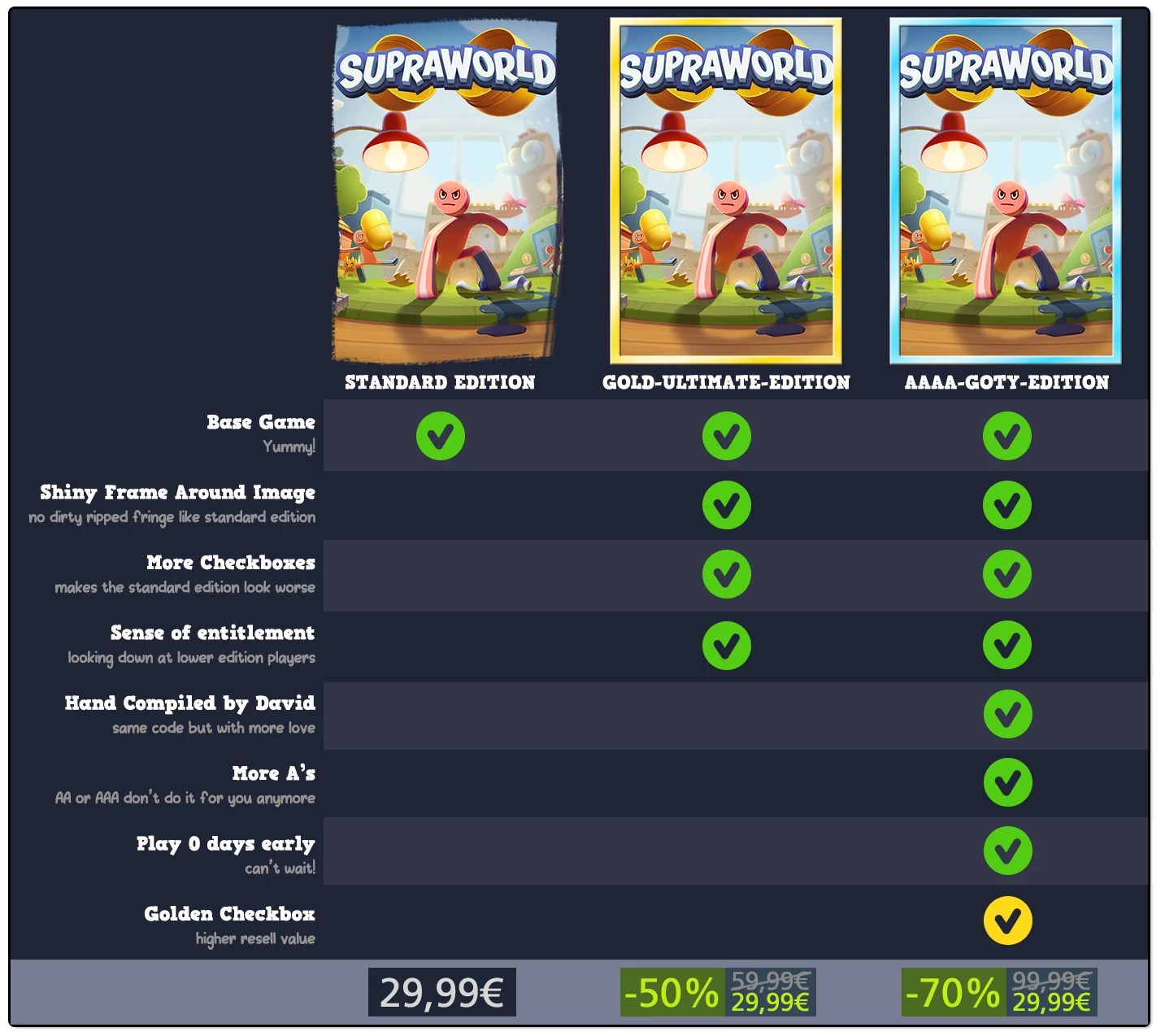Примітно, що просуваючи свій проект, розробники з іронією обіграли популярні тренди в ігровій індустрії, запропонувавши гумористичні видання: Standard Edition, Gold-Ultimate-Edition та AAAA-GOTY-Edition, де дорожчі версії включають в себе такі бонуси, як блискуча рамка навколо обкладинки та відчуття власної значущості.
