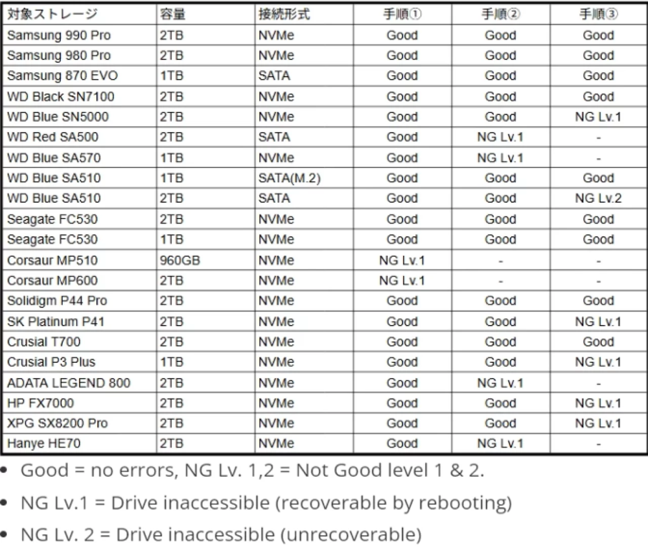 Технічний ентузіаст Такахіро Мацуомото (@Necoru_cat) детально протестував 21 накопичувач, працюючи з великими обсягами даних, він копіював папку з Cyberpunk 2077 (92,16 ГБ) та архів відеофайлів (62,42 ГБ). Подібними маніпуляціями вдалося з'ясувати, що особливо вразливими виявилися SSD-накопичувачі на контролерах Phison. Також ця проблема підтвердилася на SSD від Corsair, Kioxia, Fikwot, SanDisk та на деяких HDD.