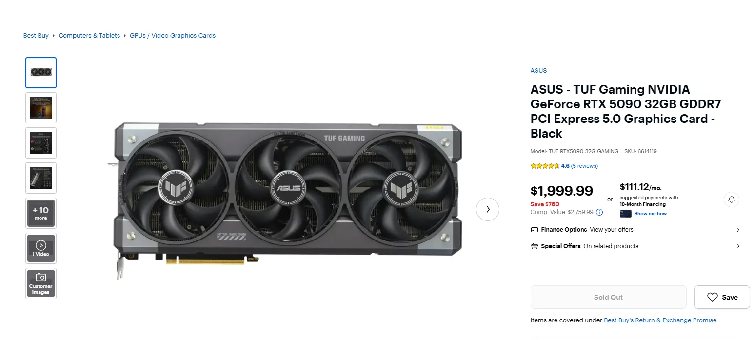 Паралельно позитивні зміни почали з'являтися і в США, там великий рітейлер Best Buy виставив на продаж ігрову відеокарту ASUS TUF Gaming RTX 5090 за мінімальною ціною виробника в $1 999 (близько 161 000 рублів). Це один з перших випадків з моменту старту продажів шість місяців тому, коли флагман можна придбати за рекомендованою вартістю.