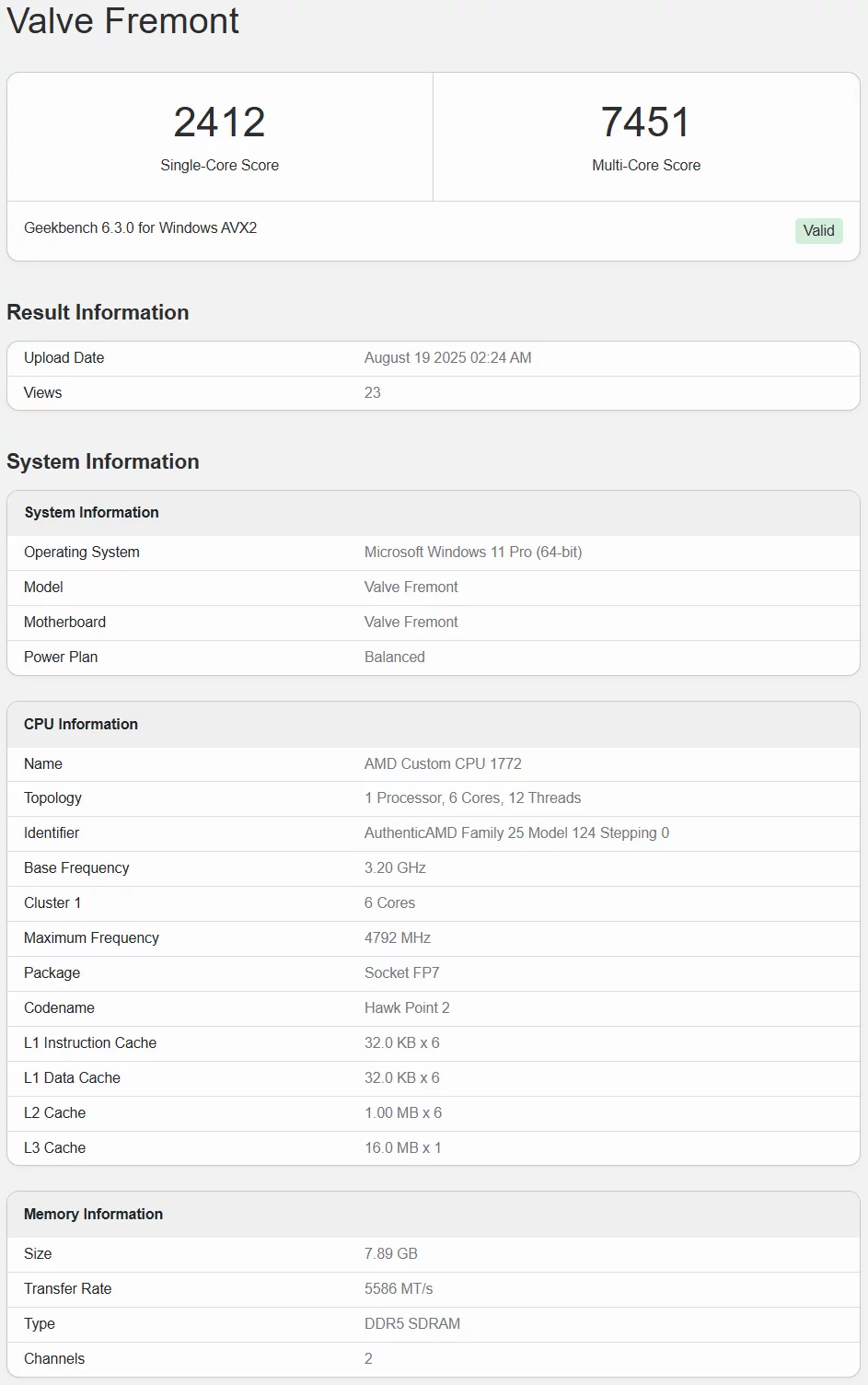 У бенчмарку Geekbench 6 Fremont набирає близько 2 412 балів в одноядерному режимі і 7 451 бал в багатоядерному. Це майже вдвічі вище, ніж у Steam Deck OLED, однак за мірками ПК результати не такі вже й вражаючі. При цьому тестова конфігурація була оснащена всього 8 ГБ оперативної пам'яті стандарту DDR5, що для кінцевого продукту здається замало. Швидше за все, в релізній версії пристрою, якщо реліз все ж таки відбудеться, цей обсяг буде збільшений.