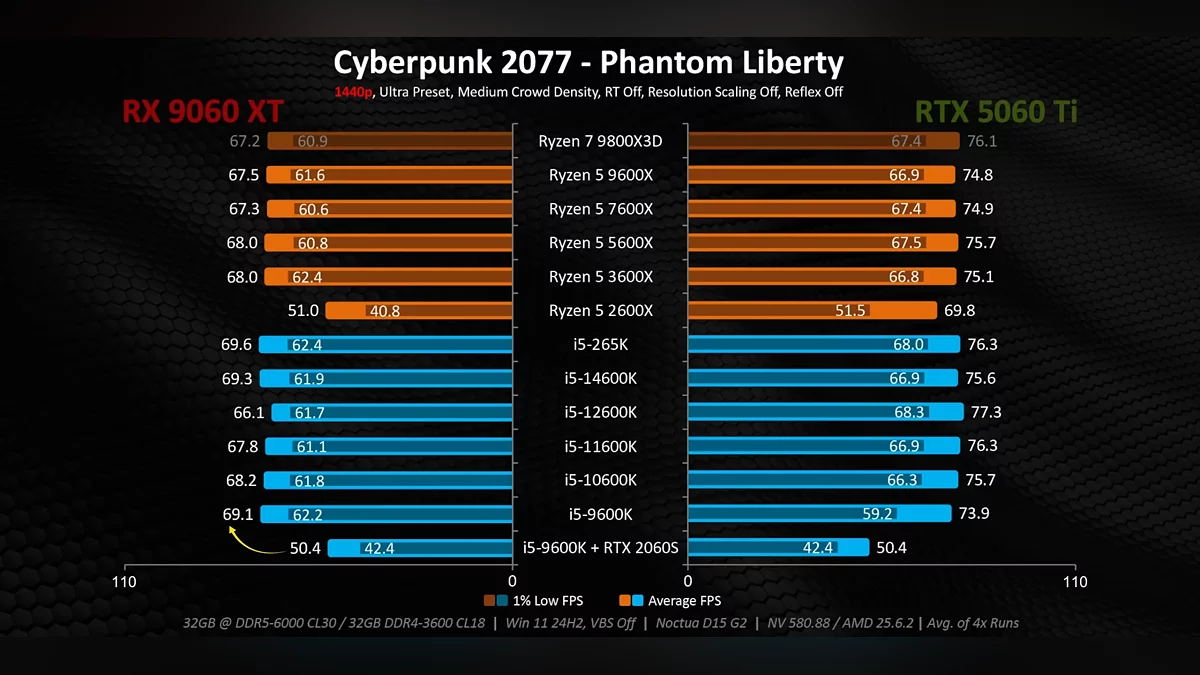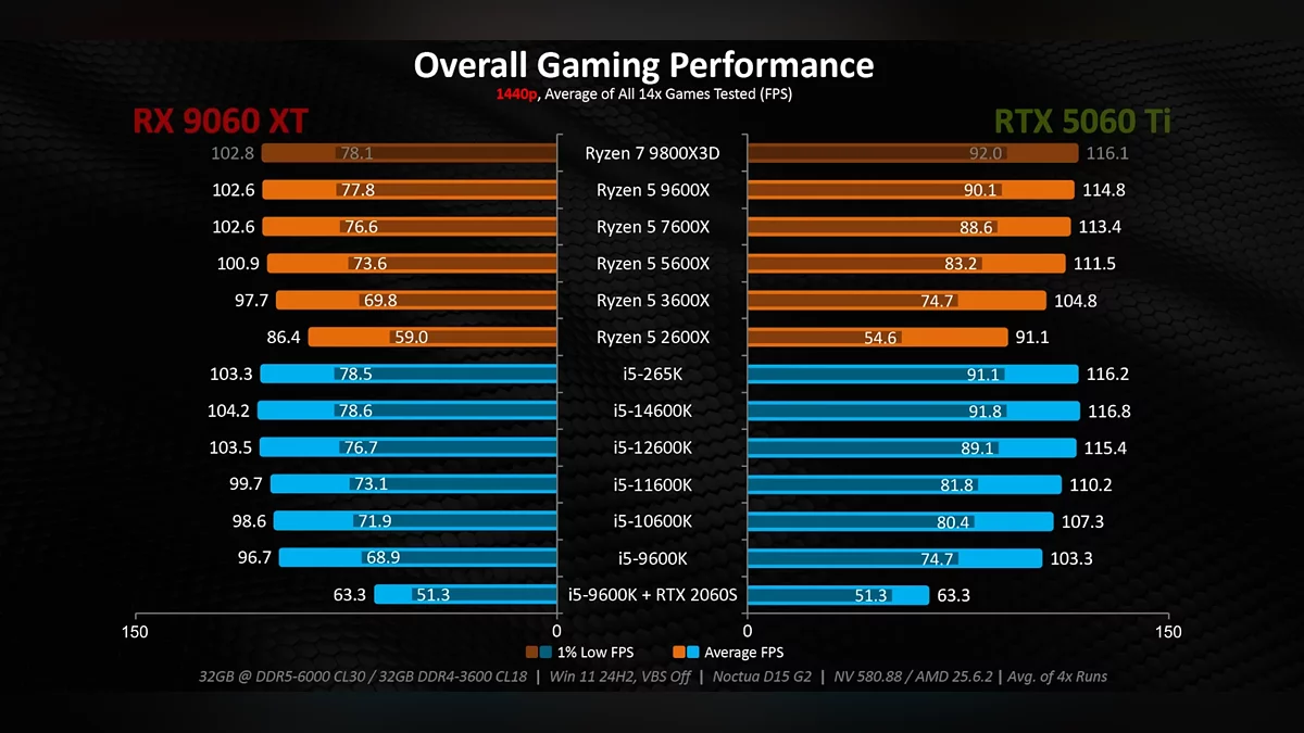 Канал Hardware Canucks перевірив, наскільки виправданий апгрейд тільки відеокарти при використанні процесорів минулих поколінь. Спеціалісти взяли дві нові моделі — AMD Radeon RX 9060 XT і NVIDIA GeForce RTX 5060 Ti з 16 ГБ пам'яті — і протестували їх у парі з 11 різними процесорами Intel і AMD, випущеними з 2018 по 2025 рік.
