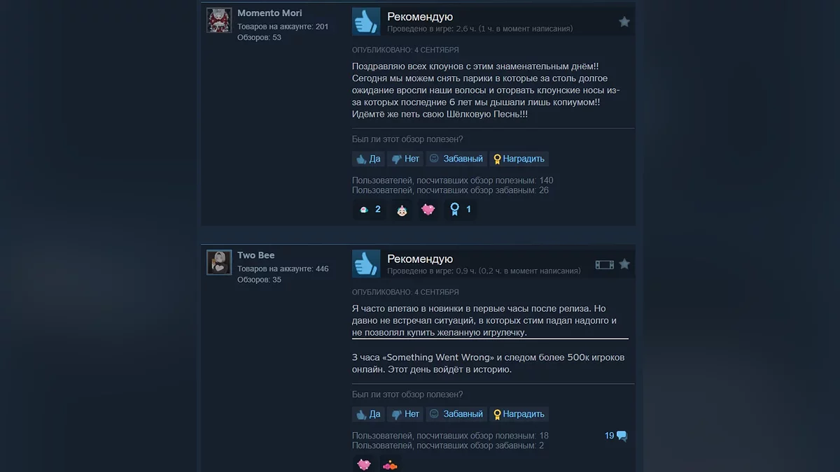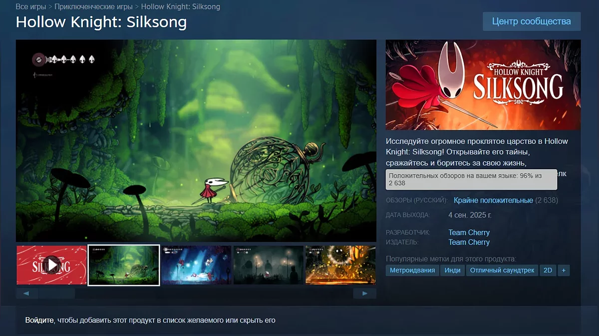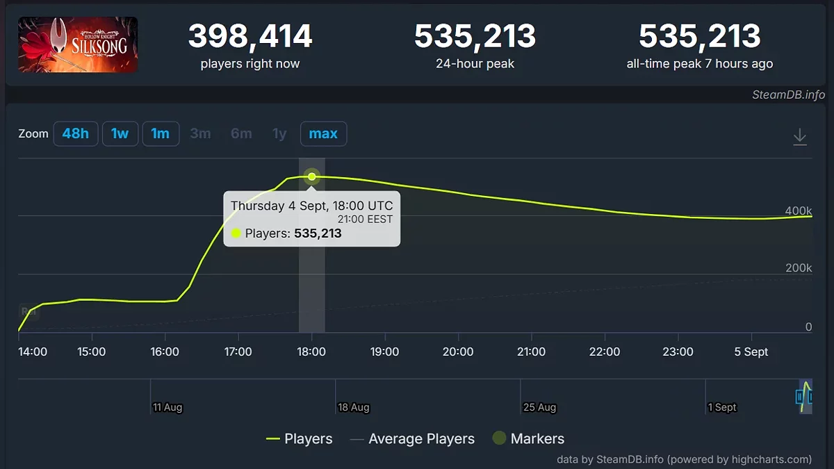 4 вересня відбувся реліз довгоочікуваної метроідванії Hollow Knight: Silksong, яка через наплив гравців «зламала» сервери Steam, внаслідок чого сторінка проєкту була недоступна деякий час. За один день гра зібрала понад 2 тис позитивних відгуків. На момент написання новини рейтинг становить 96%.