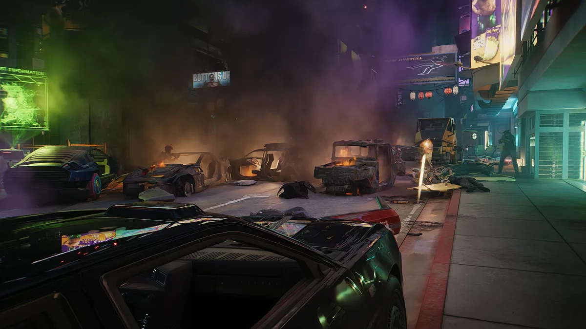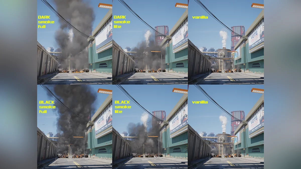З модом перестрілки в Найт-Сіті стануть ще видовищнішими. Дим стає більш густим і об'ємним, а проходячий крізь нього неоновий світло робить картинку неймовірно красивою. Що найцікавіше, мод ніяк не впливає на оптимізацію.
