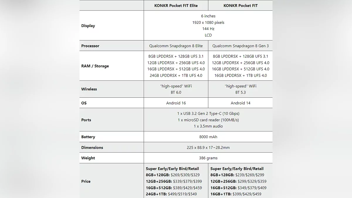 Молодша модель, Pocket FIT, оснащена чипом Snapdragon G3 Gen 3 і постачається з операційною системою Android 14. Старша версія, Pocket FIT Elite, побудована на базі більш потужного Snapdragon 8 Elite і одразу отримає Android 16. Обидва пристрої підтримують до 1 ТБ вбудованої пам'яті. Обидві консолі мають однаковий корпус з 6-дюймовим IPS-екраном. Роздільна здатність дисплея становить 1920x1080 пікселів, а частота оновлення — 144 Гц, що обіцяє плавну картинку в іграх.