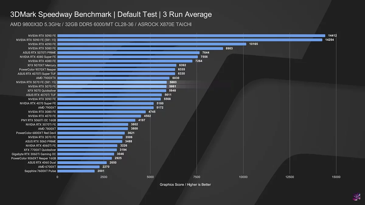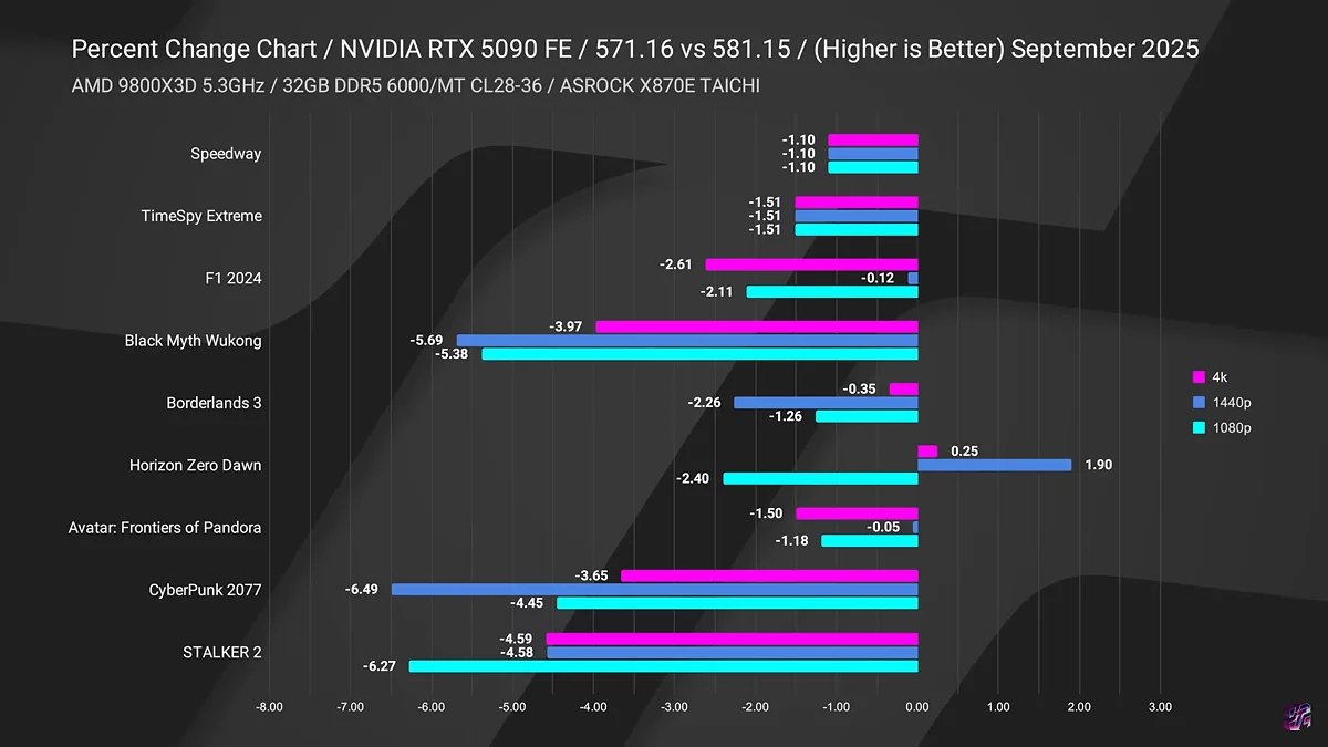 В ході тестування використовувалися як синтетичні бенчмарки Speedway і Time Spy Extreme, так і набір сучасних ігор, включаючи Cyberpunk 2077, Black Myth: Wukong і S.T.A.L.K.E.R. 2. Результати показали послідовне падіння частоти кадрів після встановлення свіжого драйвера версії 581.15 порівняно з більш старим 572.16.