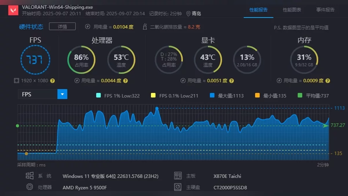 Тестування в роздільній здатності 1080p з високими налаштуваннями графіки показало перевагу нового шестиядерника від AMD у більшості популярних ігор. У дев'яти з десяти ігрових сценаріїв Ryzen 5 9500F демонстрував вищий середній FPS та кращу стабільність (1% low fps). Найбільший відрив був зафіксований у Shadow of the Tomb Raider (+16,4%), Valorant (+13,7%) та Counter-Strike 2 (+9,7%). Єдиною грою, де сильніше виявився чіп від Intel, став Cyberpunk 2077.