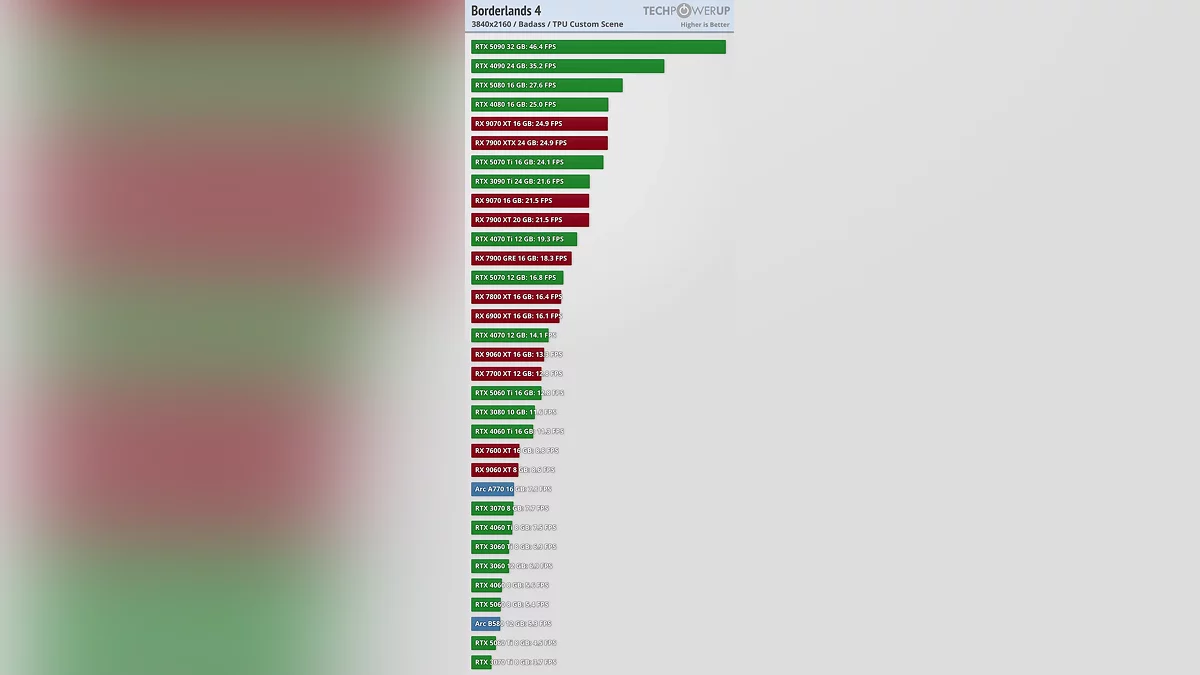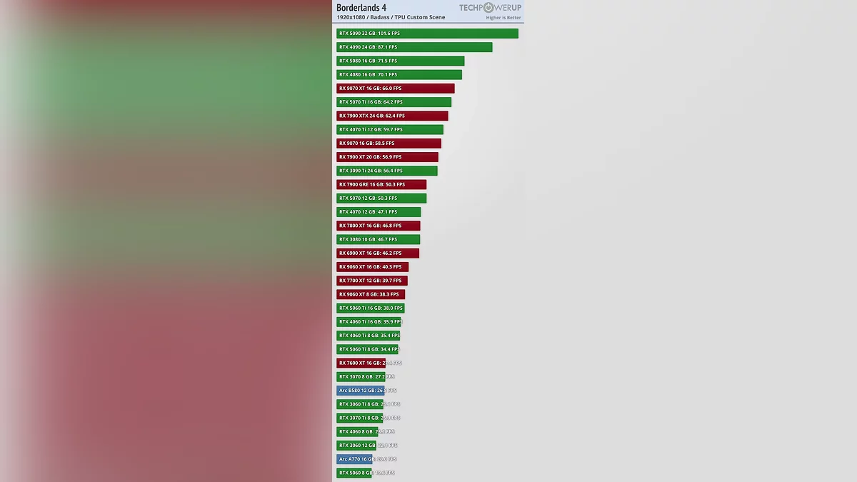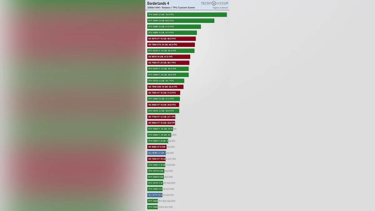 Портал TechPowerUp протестував комп'ютерну версію шутера Borderlands 4 на 33 різних відеокартах. Гра запускалася з максимальними налаштуваннями графіки без DLSS і FSR.