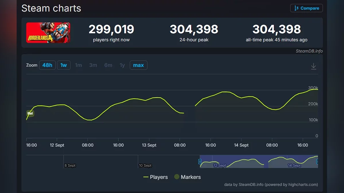 Шутер Borderlands 4, що вийшов 11 вересня, зібрав понад 300 тисяч гравців у піку онлайну в сервісі Steam. Досягти такого результату грі вдалося через 3 дні після релізу.