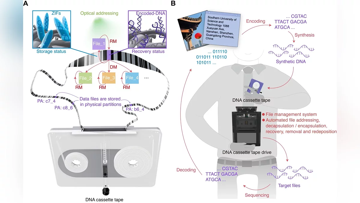 Китайські дослідники розробили принципово новий носій інформації на основі ДНК, виконаний у форматі касетної стрічки. Нова технологія обіцяє революцію в галузі довгострокового зберігання великих обсягів даних, але поки що стикається з проблемами в реалізації.