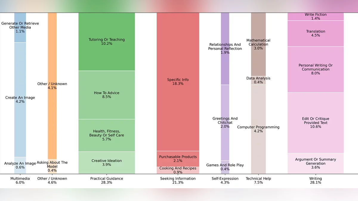 Однак ключові висновки роботи дивують: всупереч очікуванням, штучний інтелект став для людей скоріше особистим помічником, а не професійним інструментом. Якщо в червні 2024 року 47% запитів були так чи інакше пов'язані з роботою, то до літа 2025 року ця частка впала до 27%, а переважна більшість — 73% повідомлень — тепер стосуються особистих тем, хобі та побутових питань.