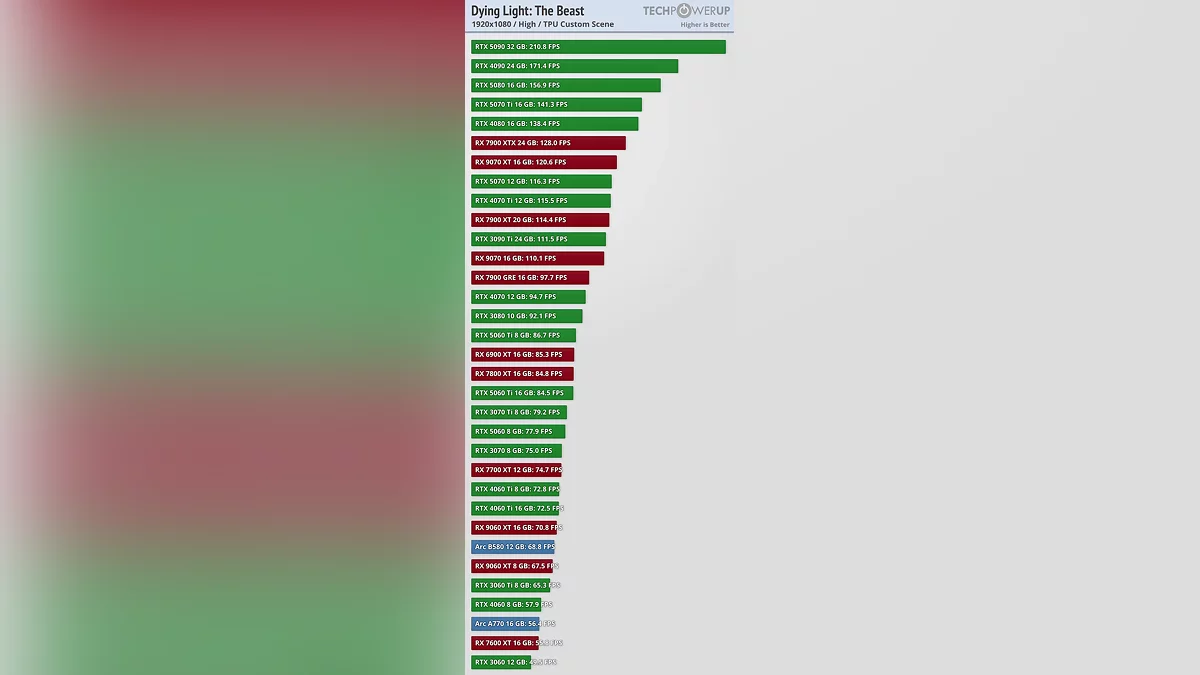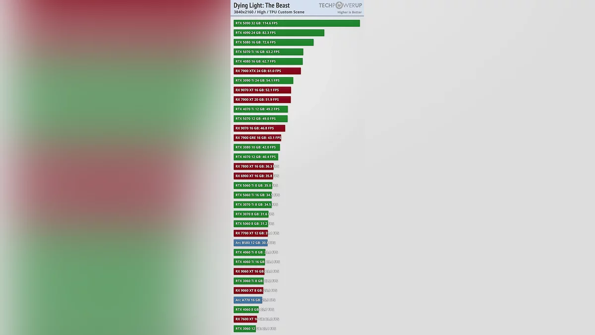 Портал TechPowerUp протестував PC-версію Dying Light: The Beast на 33 різних відеокартах від NVIDIA, AMD та Intel. Гра запускалася з максимальними налаштуваннями графіки без DLSS/FSR.