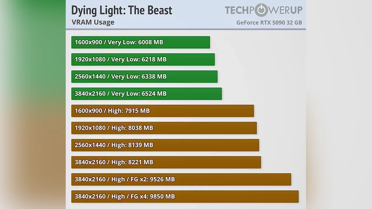 Dying Light: The Beast не споживає великої кількості VRAM, що не дивно, враховуючи низьку якість текстур, яку ми спостерігаємо в багатьох місцях. На максимальних налаштуваннях і роздільній здатності 4K гра використовує близько 8 Гб VRAM, а з генерацією кадрів — близько 10 Гб. Це означає, що відеокарти з 8 Гб VRAM будуть добре справлятися, хоча їх відеопам'ять буде досить сильно завантажена навіть при роздільній здатності 1080p. На найнижчих налаштуваннях використання VRAM трохи перевищує 6 Гб, тому відеокартам з 6 Гб VRAM або менше буде важко обробляти гру, або їм доведеться постійно обмінюватися даними між GPU та основною пам'яттю, що серйозно вплине на продуктивність.