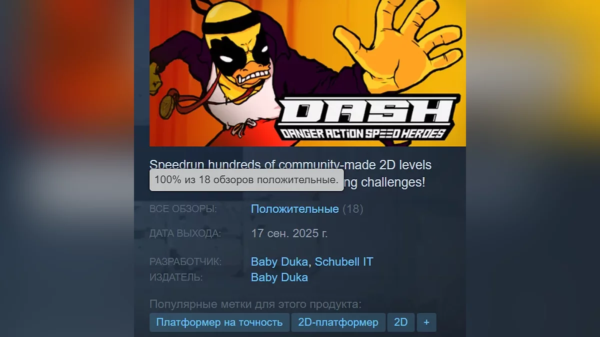 DASH: Danger Action Speed Heroes — двомірний платформер на точність, який з 2019 року знаходився в ранньому доступі. Проект отримав 100% позитивних відгуків. Сторінка в Steam.