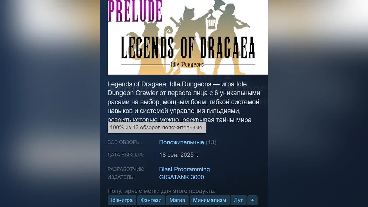 Legends of Dragaea: Idle Dungeons Prelude — гра в жанрі Idle Dungeon Crawler, де потрібно досліджувати похмурі підземелля з небезпечними монстрами. Є своєрідною демоверсією Legends of Dragaea: Idle Dungeons, яка знаходиться в розробці. Має 100% рейтингу. Сторінка в Steam.