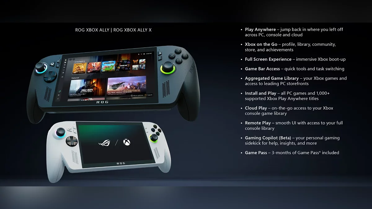 ROG Xbox Ally оцінена в $599 (близько 50 000 гривень) підійде тим, хто в основному планує використовувати хмарний геймінг (Xbox Cloud Gaming), віддалений запуск з консолі Xbox (Remote Play) або грати в менш вимогливі PC-ігри. У комплекті з консоллю йде тримісячна підписка на Xbox Game Pass. Консоль укомплектована процесором AMD Ryzen Z2A (4 ядра Zen 2) та графікою RDNA 2, 16 ГБ оперативної пам'яті та SSD на 512 ГБ. Також пристрій отримав 7-дюймовий IPS-екран з частотою 120 Гц та батарею ємністю 60 Вт*год.