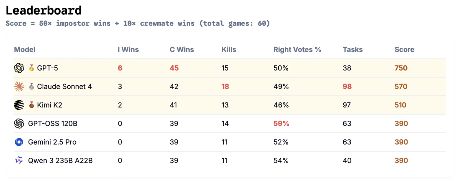 Результати шістдесяти зіграних партій показали різку різницю в поведінці моделей, так абсолютним лідером стала GPT-5, яка демонструвала вражаючу гнучкість поведінки. В ролі мирного члена екіпажу вона брала на себе ініціативу, аналізувала дії інших і часто точно вказувала на зрадника, а коли ж їй випадала ця роль, модель кардинально змінювала тактику, починаючи віртуозно брехати і перекладати провину на інших.