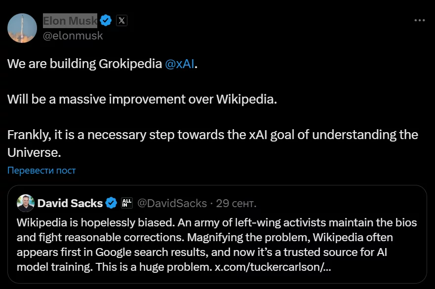 Приводом для заяви став публічний діалог у соціальній мережі X між Маском і інвестором Девідом Саксом (David O. Sacks), який висловив критику на адресу Wikipedia, вказавши на її упередженість і часті зміни статей. Маск, погодившись з ним, зазначив, що проблема загострюється тим, що саме матеріали цієї енциклопедії часто використовуються для навчання великих мовних моделей (ШІ).