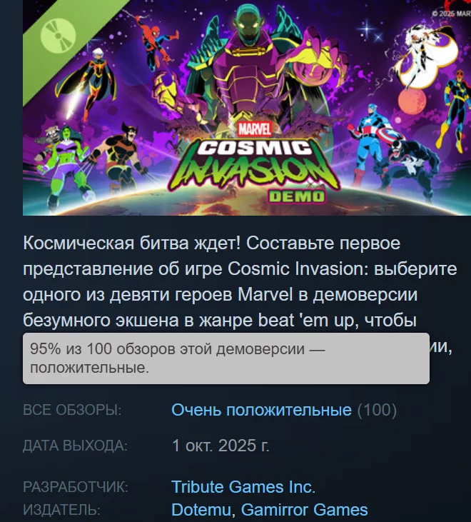 1 вересня в Steam вийшла безкоштовна демоверсія супергеройського бітемапа Marvel Cosmic Invasion. Гравці залишилися задоволені демкою — вона отримала 95% позитивних відгуків.