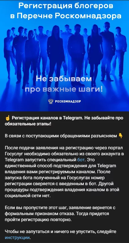 Згідно з останніми роз'ясненнями, просто вказати дані в описі каналу тепер недостатньо, і єдиним способом підтвердити свій ресурс для Роскомнагляду стала процедура з використанням спеціального бота. Після стандартної реєстрації на порталі «Державні послуги» власнику каналу необхідно через свій акаунт у Telegram запустити цього бота і надати йому повноваження адміністратора.