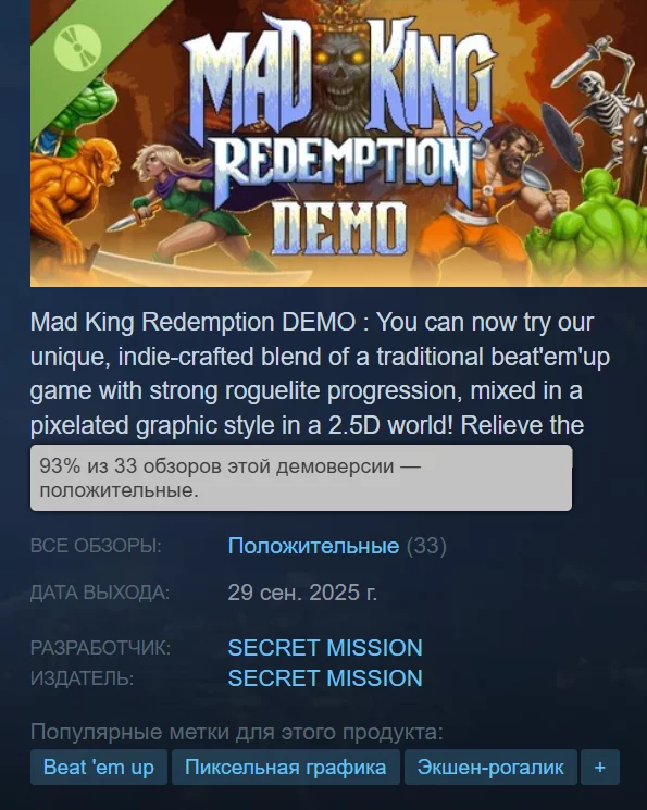 В сервісі Steam з'явилася демоверсія Mad King Redemption — суміші бітемапа і рогалика з піксельною 2,5D-графікою. У демці доступні чотири персонажі і частина першого біому.