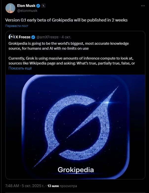Стала відома приблизна дата появи Grokipedia, нового проєкту Ілона Маска (Elon Musk), так за словами підприємця, перша тестова версія енциклопедії буде готова вже через два тижні, при цьому як надалі буде розвиватися проєкт поки чітких планів немає.