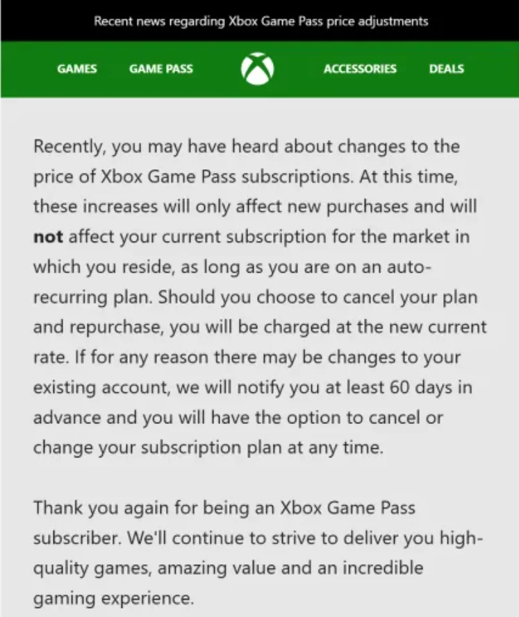 Повышення вартості підписки на Xbox Game Pass торкнеться не всіх, адже поточні користувачі ігрового сервісу в ряді країн поки залишаться при попередніх цінах. Зміни в ціновій політиці, про які компанія повідомила на початку жовтня, тепер мають вибірковий характер. У таких країнах, як Німеччина, Польща, Ірландія, Південна Корея, Індія, Австрія та Ізраїль, новий, вищий тариф буде застосовуватися тільки до тих, хто оформить підписку заново, а діючі користувачі продовжать платити стільки ж, скільки і раніше.