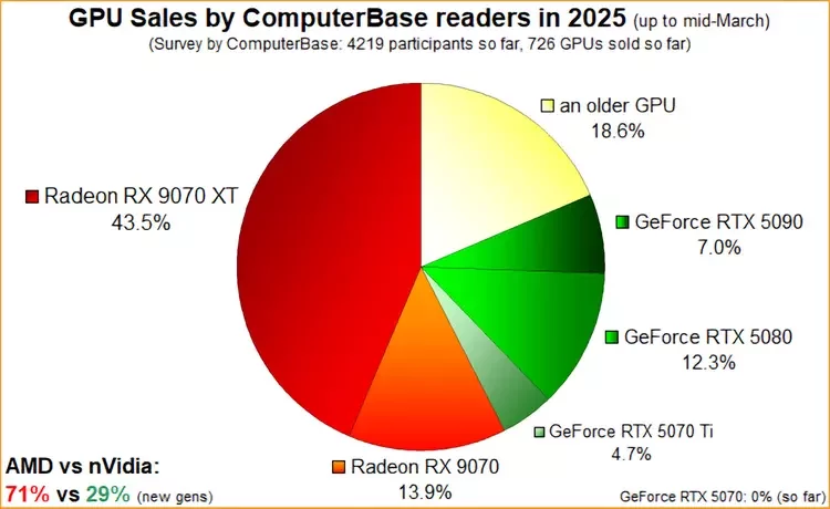 Статистика продажів демонструє суттєвий відрив «червоних» у середньому ціновому сегменті. Наприклад, модель Radeon RX 9070 XT виявилася більш ніж у два рази популярнішою за свою пряму конкурентку — GeForce RTX 5070 Ti, при цьому молодші моделі також не відстають: RX 9060 XT купують у два рази частіше, ніж RTX 5060 Ti. Загальна картина по новому поколінню графічних прискорювачів в Австралії складається в співвідношенні 56% у NVIDIA проти 44% у AMD, при цьому цифри помітно відрізняються від даних деяких аналітичних агентств, які відводять AMD лише кілька відсотків загального ринку.