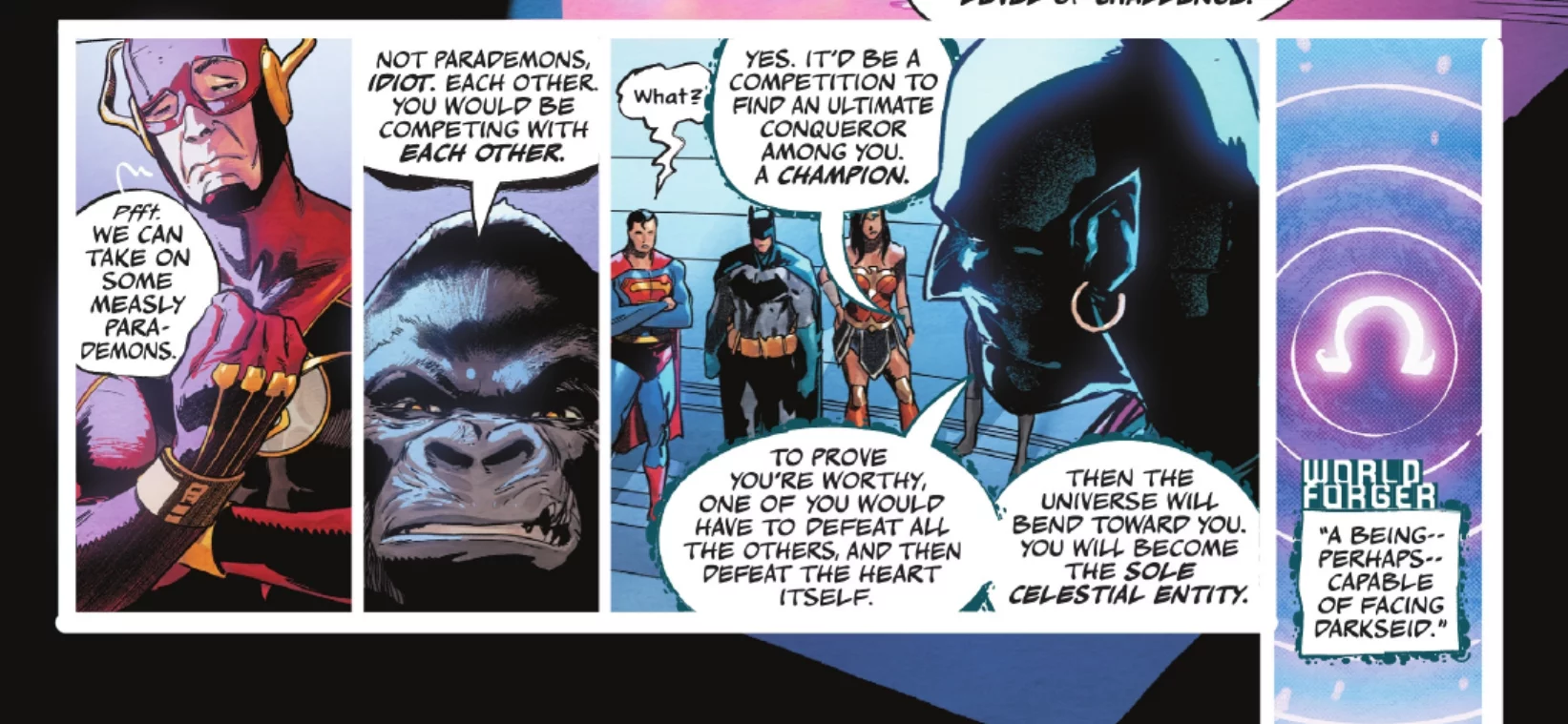 До фіналу першого номера залишається 32 учасника, включаючи абсолютні версії Супермена, Бетмена та Чудо-жінки — темні відображення героїв з нової всесвіту. Однак один з них, як виявляється, вже одержим самим Дарксайдом.