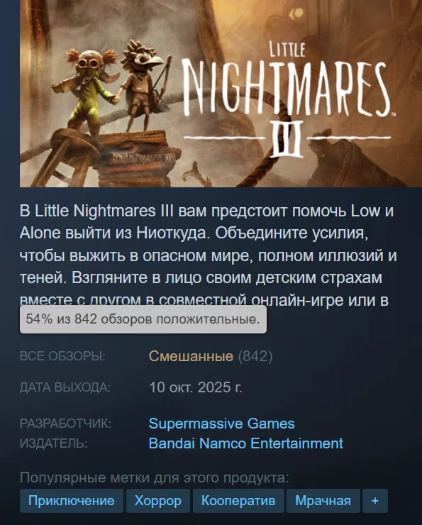 Хоррор Little Nightmares 3 не зміг вразити гравців — проєкт отримав 54% позитивних відгуків у Steam. Критики також прохолодно прийняли новинку (74/100 балів на OpenCritic).