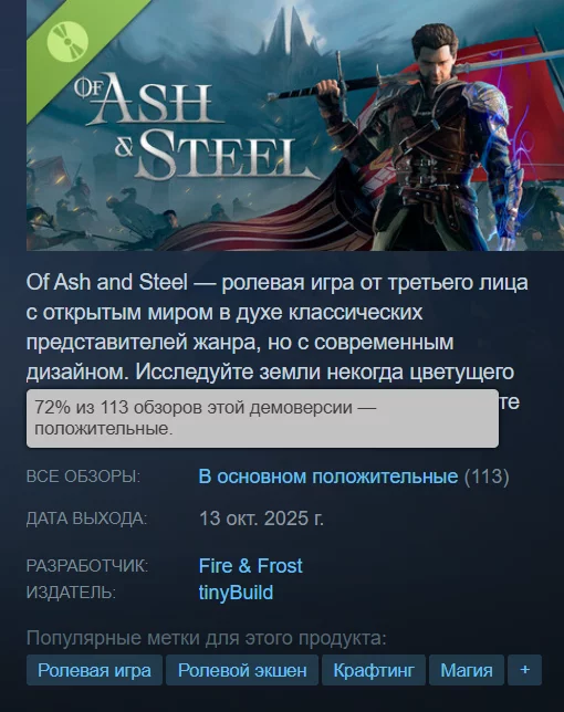В рамках фестивалю Next Fest у Steam вийшла демоверсія рольової гри з відкритим світом Of Ash and Steel, над якою працює російська студія Fire & Frost. Демка отримала 72% рейтингу.