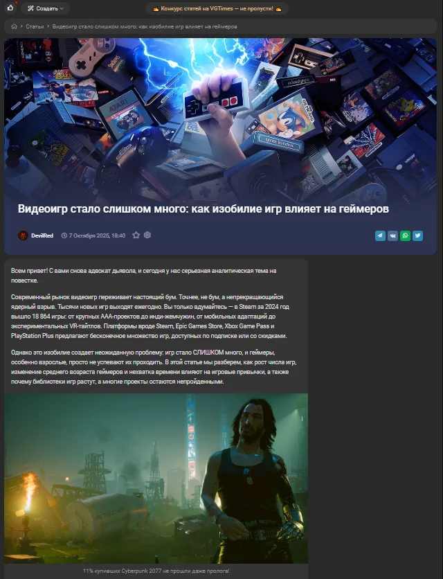 Редакція VGTimes присуджує перше місце користувачу DevilRed за його аналітичне есе «Відеоігор стало занадто багато: як надмірність ігор впливає на геймерів»! При відборі кандидатів ми відзначили животрепещучу для сучасних гравців тему, детальне розкриття проблеми та обсяг проведеного дослідження. Вітаємо з перемогою!