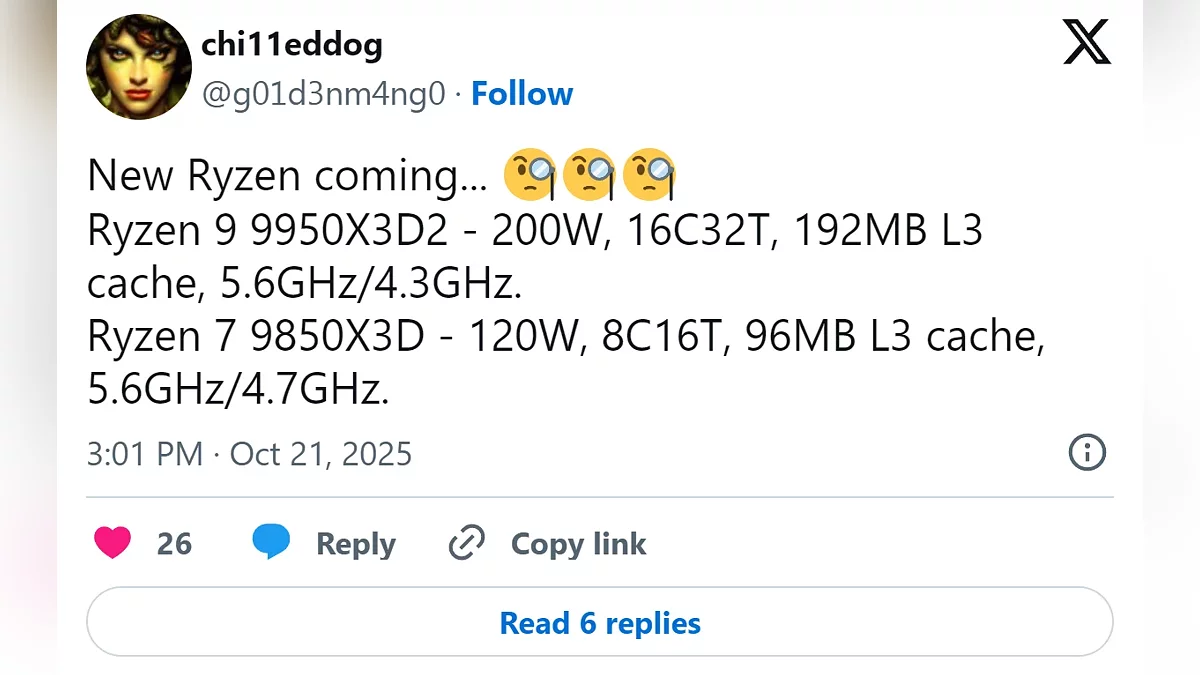 Особливий інтерес у геймерів може викликати модель 9850X3D, яка, судячи з специфікацій, усуне один з небагатьох недоліків попереднього покоління — невелике відставання по піковій частоті від звичайних версій. Точні терміни появи цих процесорів у продажу, як і їх остаточна вартість, поки залишаються невідомими, при цьому офіційних коментарів від AMD з цього приводу також поки не надходило.