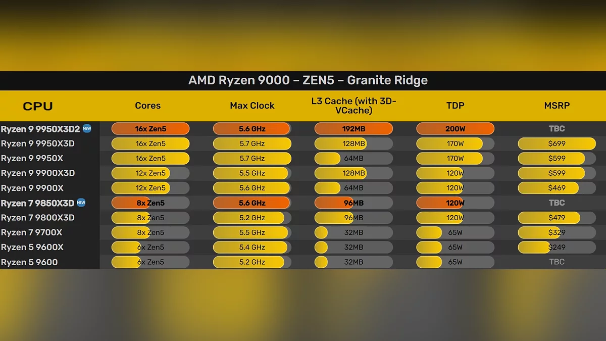 Флагманом оновлення має стати процесор Ryzen 9 9950X3D2, ключовою особливістю якого стане використання одразу двох кристалів з додатковою кеш-пам'яттю 3D V-Cache, що дозволить процесору отримати 192 МБ кешу третього рівня. Для порівняння, у поточних топових рішеннях цього сімейства об'єм L3 складає 128 МБ. За попередніми даними, процесор буде мати 16 ядер, базову частоту 4.3 ГГц і зможе розганятися до 5.6 ГГц, при цьому теплопакет новинки оцінюється в 200 Вт.