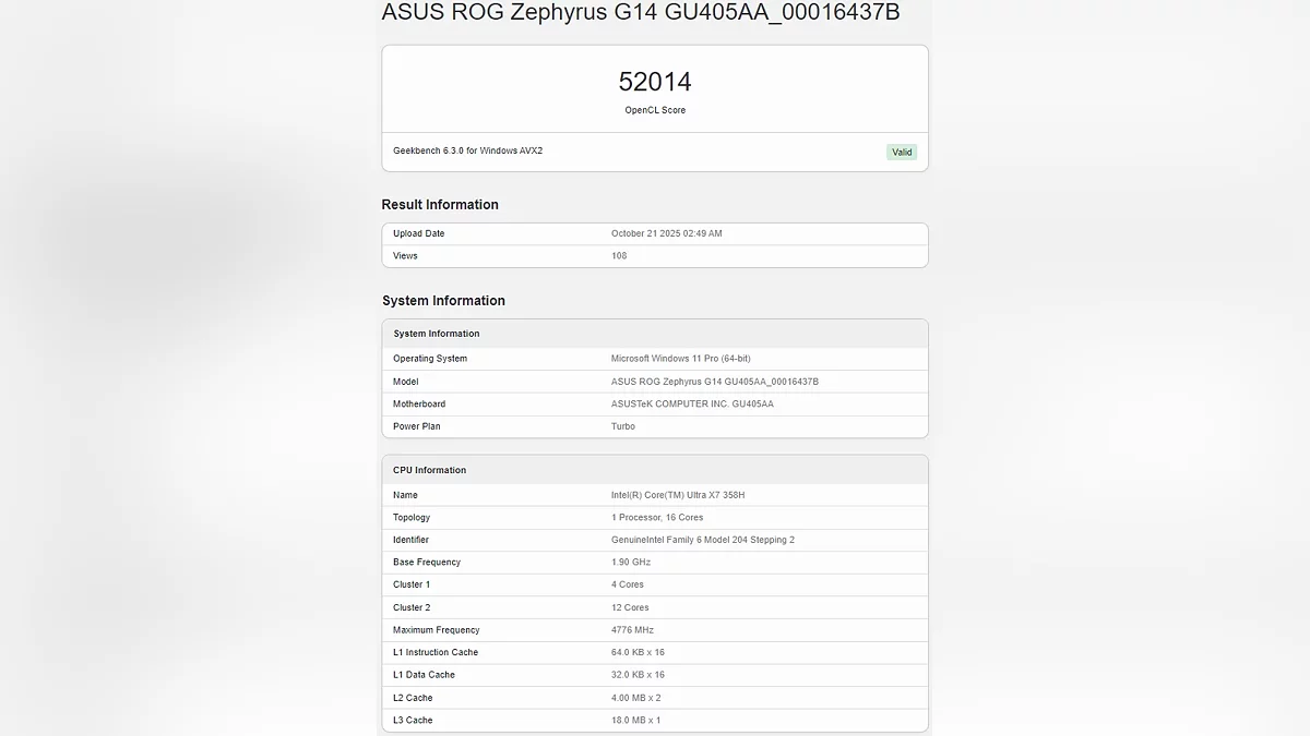 В мережі з'явилися перші дані про продуктивність нового процесора Intel, що ховається під назвою Core Ultra X7 358H. Інформація, що потрапила в базу тестів Geekbench, розкриває потенціал інтегрованої графіки, яка наблизилася до рівня деяких дискретних рішень. Випробування проводилися на ігровому ноутбуці ASUS ROG Zephyrus G14. Результати в тесті OpenCL варіювалися від 46 до 52 тисяч балів, що типово для ранніх зразків.