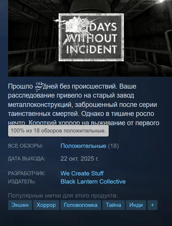 Days Without Incident — короткий хоррор від першої особи, події якого розгортаються на занедбаному заводі. Проєкт отримав 100% позитивних відгуків. Сторінка в Steam.