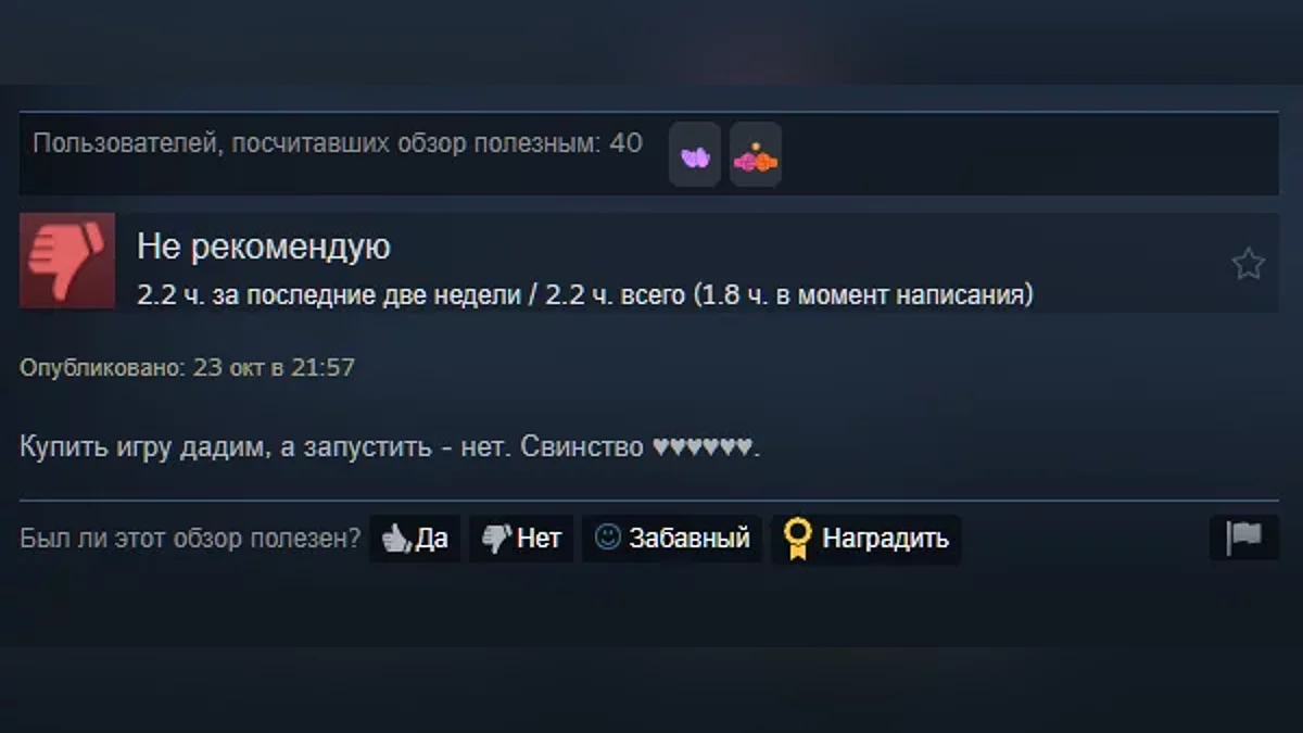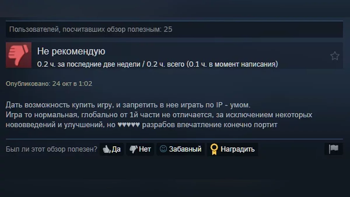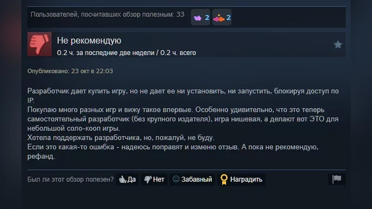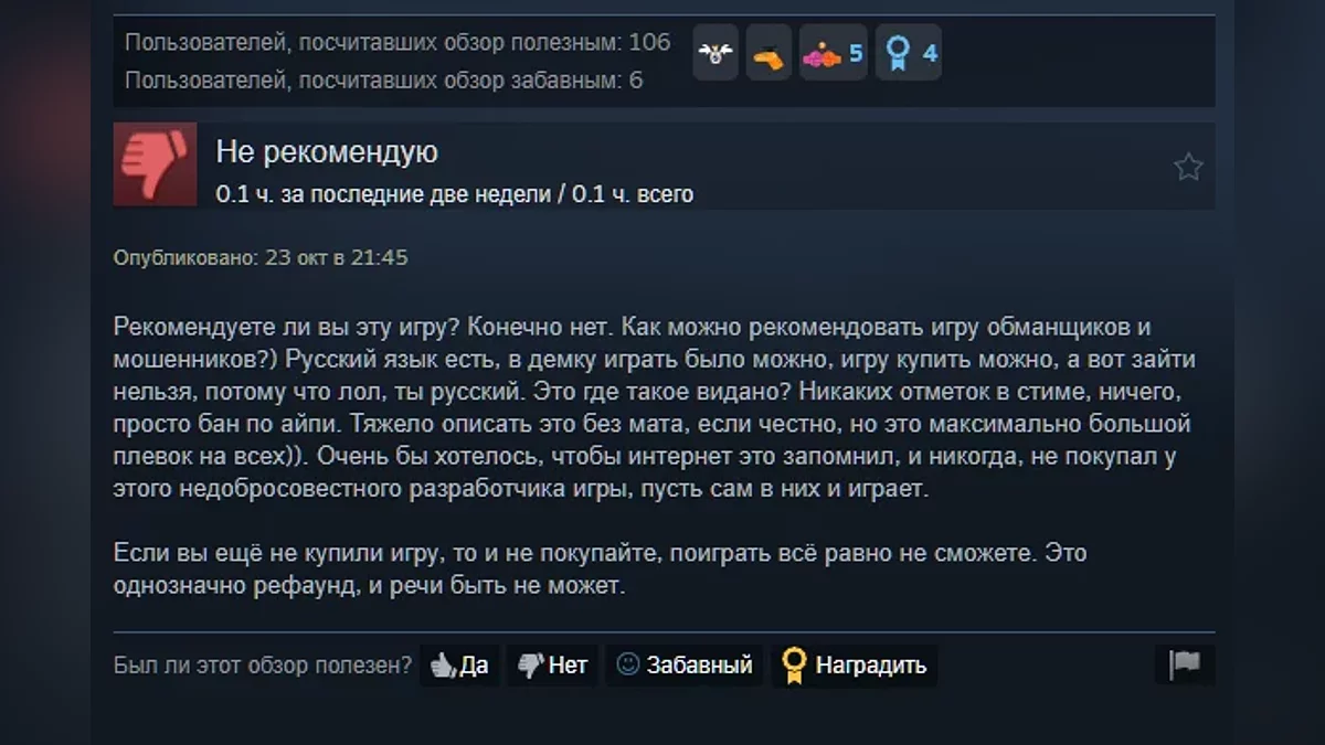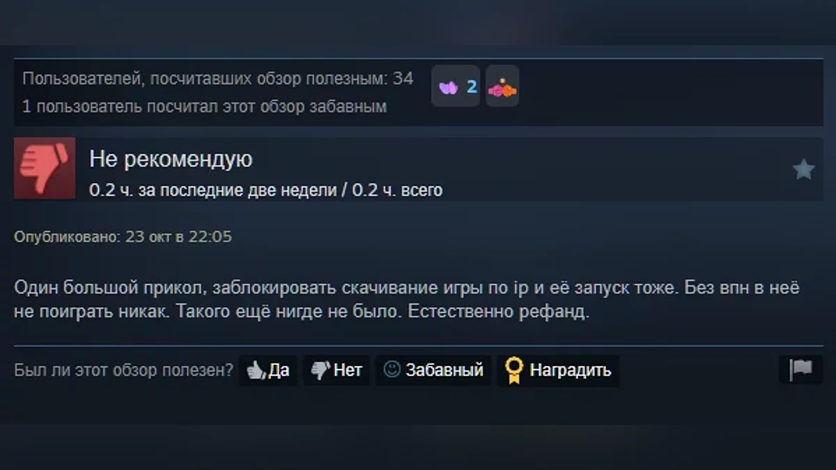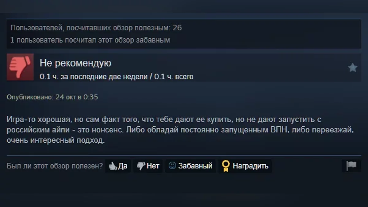 Слід зазначити, що безліч російськомовних геймерів поставили новинці негативний відгук. Судячи з коментарів, розробники обмежують доступ пристроям з російськими IP-адресами, навіть якщо гра куплена в іншому регіоні. Деякі користувачі написали, що гра також не працює в Казахстані, хоча доступна для покупки за 6400 тенге (970 рублів).