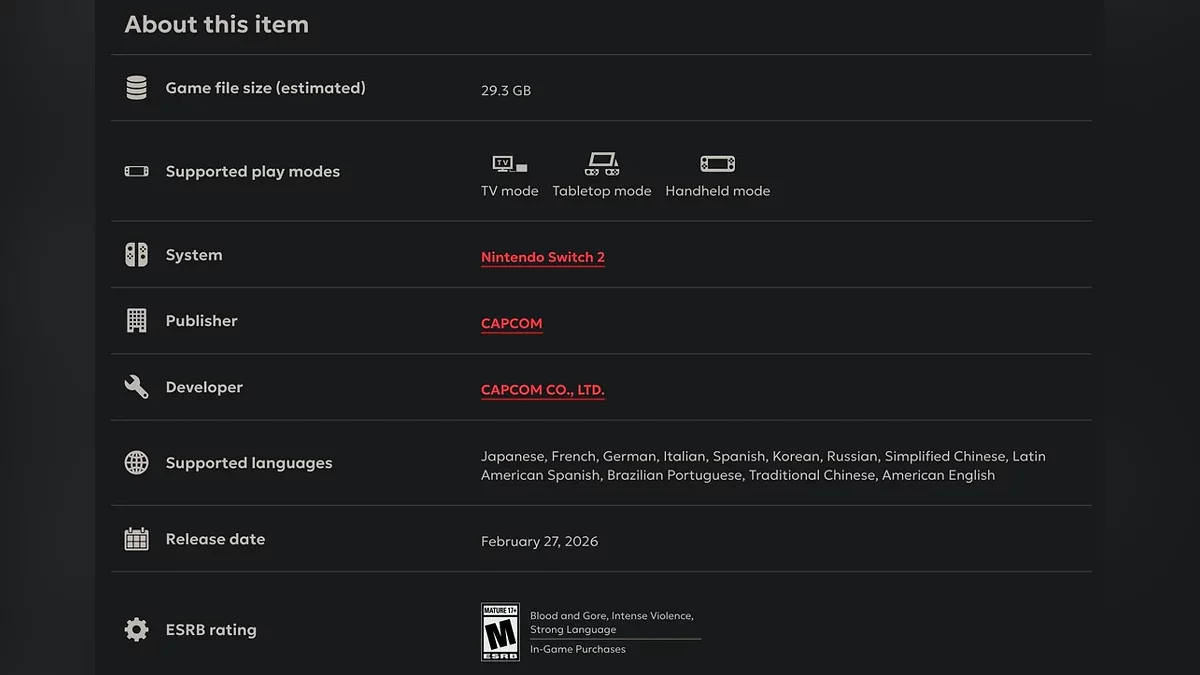 Якщо вірити сторінці гри (яку вже видалили), її ціна складе $70 — цілком передбачувана сума для сучасних великих релізів. Малоймовірно, що щось зміниться для інших платформ, тож можна розраховувати на витік до передзамовлень інформації. Точні цифри назвуть лише 29-30 жовтня, коли Capcom офіційно виставить цінник для бажаючих придбати гру до релізу.