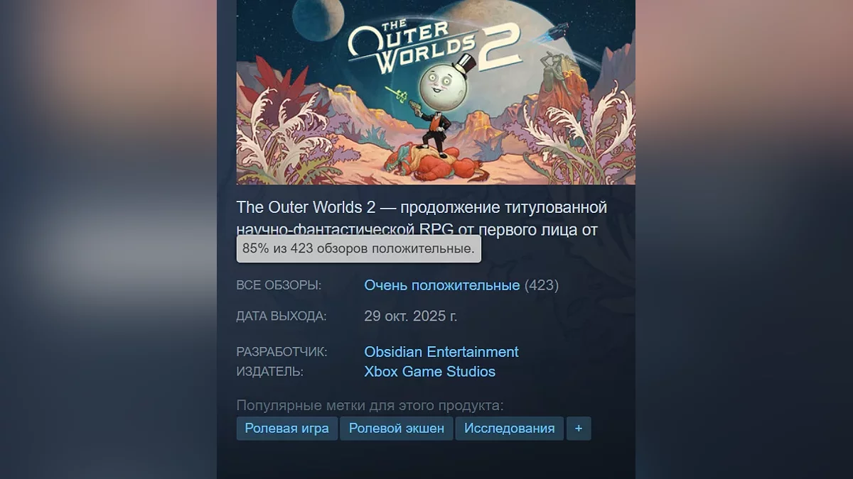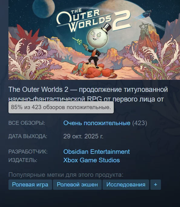 24 жовтня відбувся ранній реліз The Outer Worlds 2 — гра стала доступна власникам преміум-видання. Гравці тепло зустріли новинку — вона отримала 85% рейтингу в Steam.