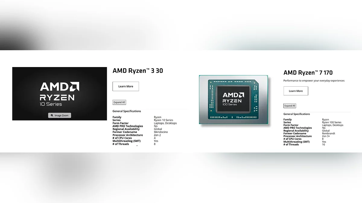 Під брендом Ryzen 10 тепер продаються 4-ядерні процесори, спочатку створені для бюджетних пристроїв. Їх продуктивність забезпечує перевірена архітектура Zen 2, а сімейство Ryzen 100 позиціонується вище і включає в себе більш потужні 8-ядерні моделі на архітектурі Zen 3+. Фактично, це ті ж чіпи, які раніше вже були представлені в серіях 7020U і 7035HS, але з іншими назвами.