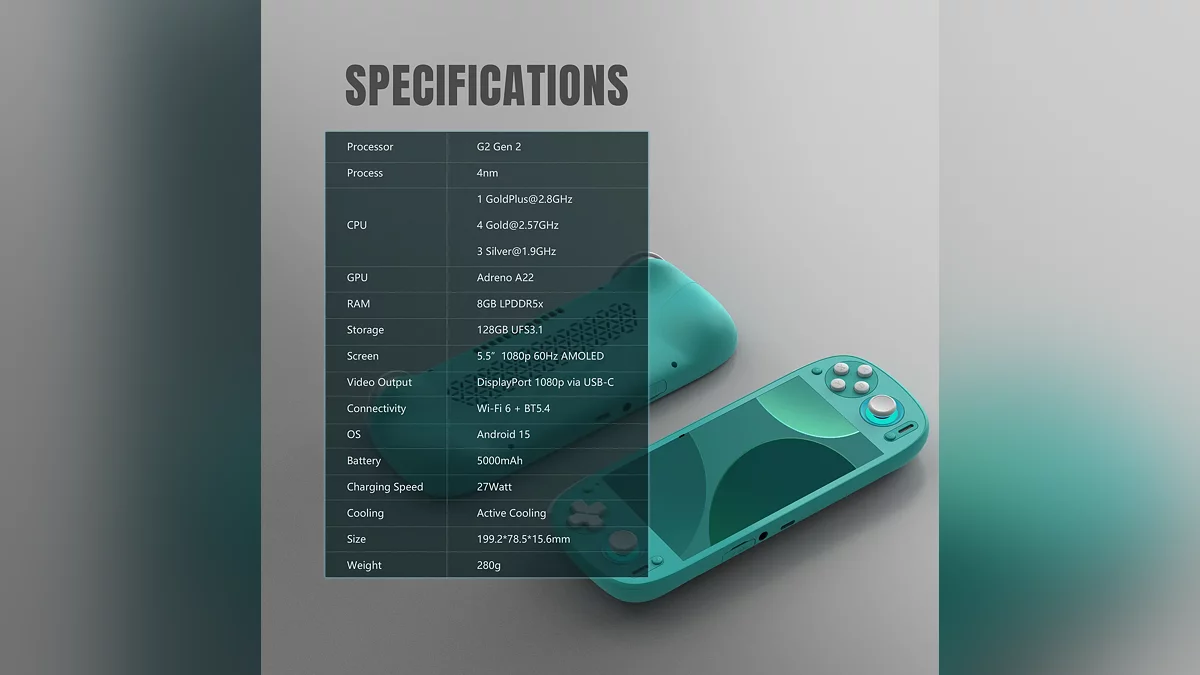 Retroid Pocket G2 можна охарактеризувати як оновлену версію моделі Pocket 5. Пристрій зберегло той же корпус і дизайн, що забезпечує сумісність з аксесуарами від попередньої моделі, але отримало більш сучасну начинку. Консоль отримає 8 ГБ оперативної пам'яті LPDDR5x та накопичувач на 128 ГБ. Акумулятор консолі трохи менший, ніж у старшої версії і складає 5 000 мА*год, але на відміну від старшої моделі вона працюватиме вже на базі Android 15.