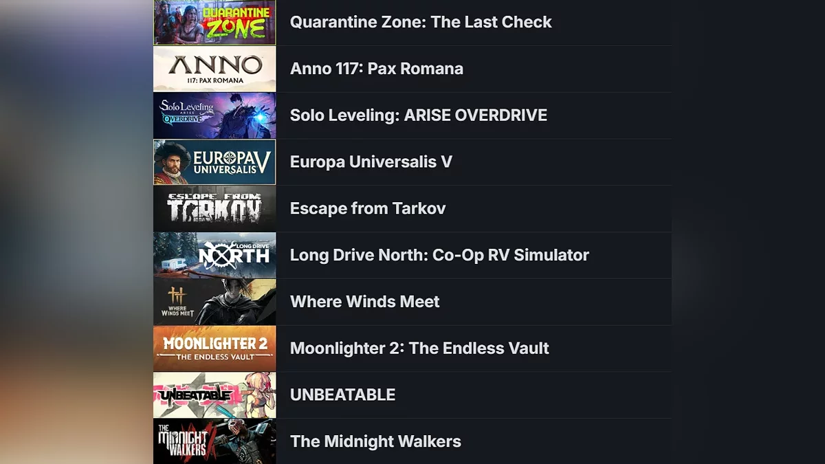 У ТОП-10 не змогли потрапити Call of Duty: Black Ops 7 (11 місце), Of Ash and Steel (12 місце), Football Manager 26 (16 місце), Sonic Rumble (19 місце), City Car Driving 2.0 (24 місце), Assetto Corsa Rally (31 місце), Terminator 2D: NO FATE (33 місце), SpongeBob SquarePants: Titans of the Tide (39 місце), Sacred 2 Remaster (42 місце), Surviving Mars: Relaunched (43 місце) та Syberia — Remastered (47 місце).