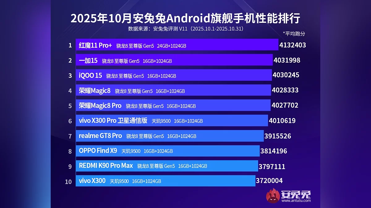 С появою нових процесорів Snapdragon 8 Elite Gen5 та Dimensity 9500 щомісячний рейтинг бенчмарка AnTuTu кардинально оновився, представивши повністю оновлений список лідерів. Вся перша десятка рейтингу тепер складається з пристроїв, які були представлені буквально в останній місяць, а боротьба за перші місця розгорнулася між флагманами, орієнтованими на максимальну швидкість та просунуті ігрові можливості.