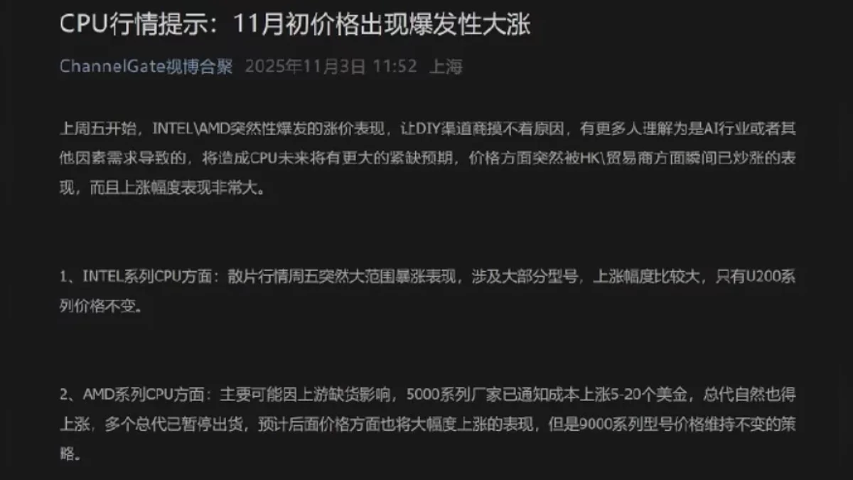 В початку листопада ринок комп'ютерних комплектуючих зіткнувся з несподіваним подорожчанням процесорів від Intel та AMD. За даними галузевих джерел, стрибок цін почався в останні дні жовтня і торкнувся більшості популярних моделей. Серед можливих причин називають зростання попиту з боку суміжних галузей, зокрема пов'язаних з штучним інтелектом, що може призвести до дефіциту в майбутньому.