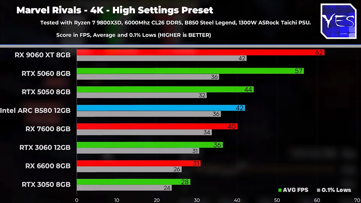В ряді популярних ігор, таких як Marvel Rivals та Fortnite, RTX 5050 стабільно випереджає конкурента, демонструючи приріст у 5-25% при роздільній здатності 1080p та 1440p, однак при переході на 4К перевага NVIDIA часто зводиться нанівець. Яскравим прикладом є Kingdom Come: Deliverance II, де різниця між картами склала лише 3%, при цьому RTX 5050 ледь утримувала плавний кадровий ритм. Водночас, у Dune: Awakening ситуація розгорнулася на користь Intel ARC B580, яка обійшла опонента хоч і незначно.