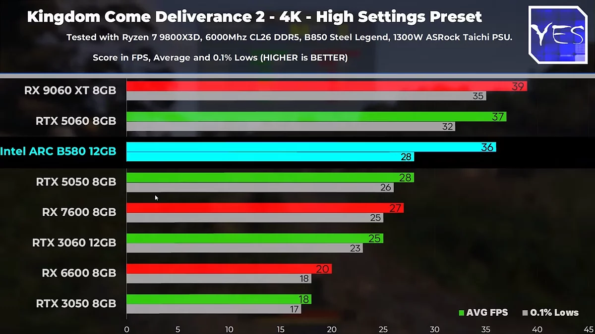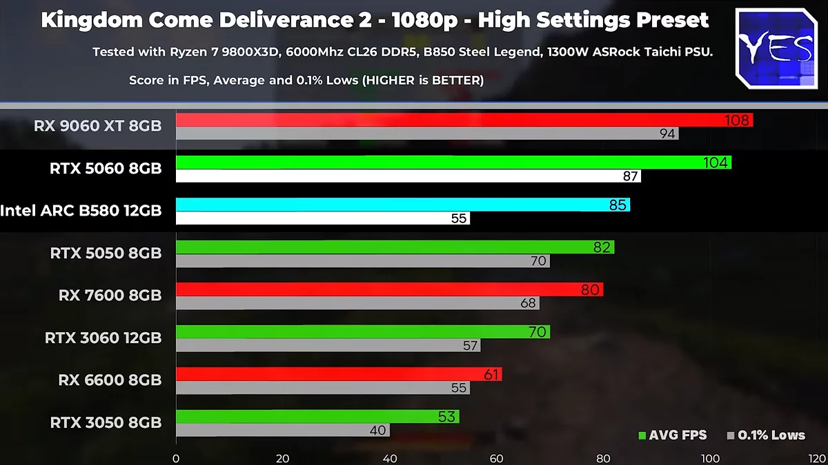 На ринку відеокарт за увагу покупців у сегменті $250 борються рішення від NVIDIA та Intel. Незалежний огляд проливає світло на те, яка з карт — GeForce RTX 5050 чи Intel Arc B580 — пропонує кращий ігровий досвід у сучасних проєктах. Тестування, проведене на платформі з потужним процесором Ryzen 9800X3D, виявило неоднозначну картину.