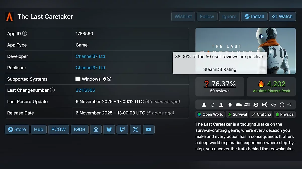 В ранньому доступі на PC (Steam та Epic Games Store) вийшов новий науково-фантастичний виживач з відкритим світом The Last Caretaker, який вже встиг отримати позитивні відгуки від геймерів — рейтинг 88% на момент написання новини. Є демоверсія.